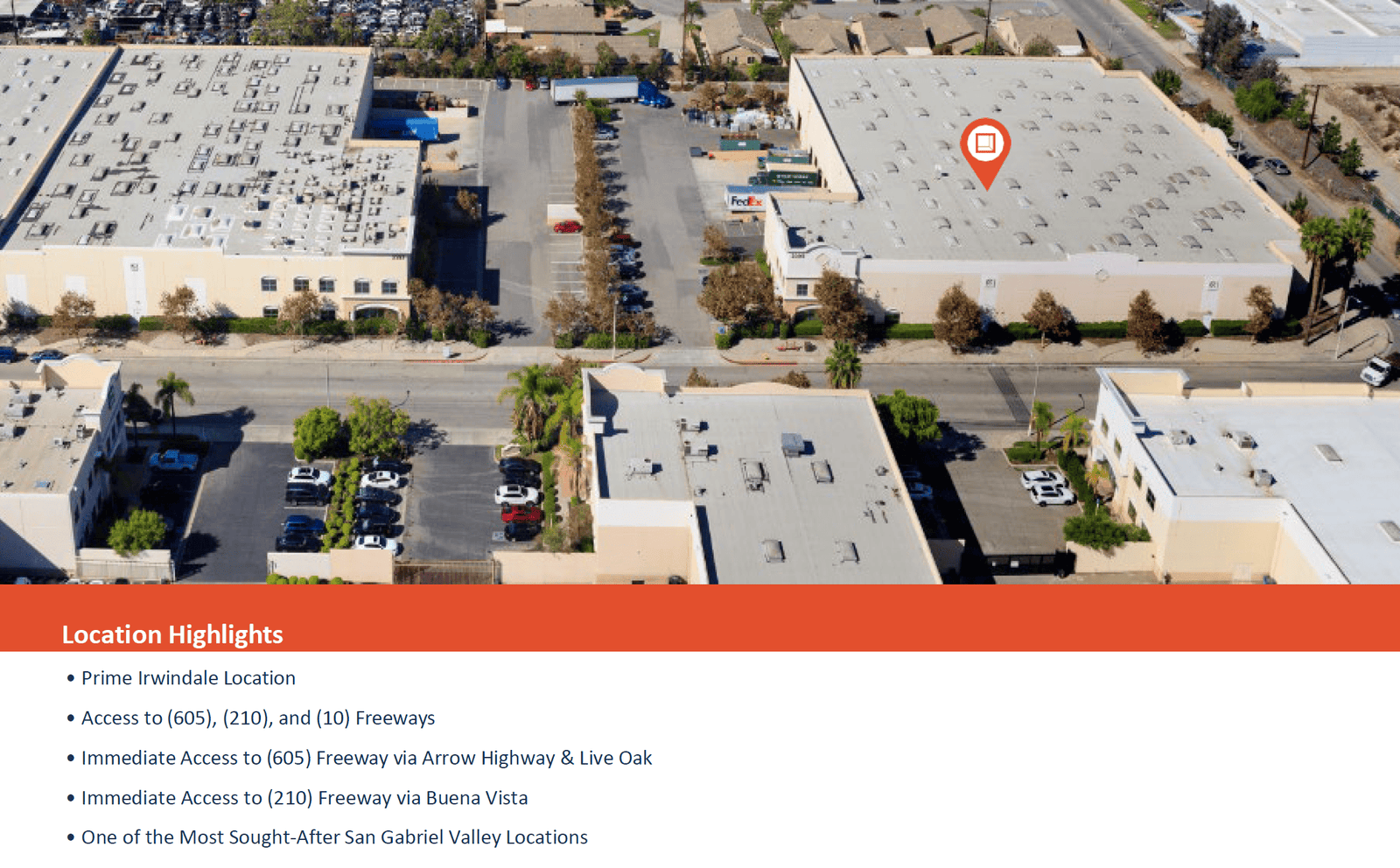 With quick access to the 605, 210, and 10 freeways via Arrow Highway, Live Oak Avenue, and Buena Vista Street, the property's Irwindale location offers outstanding regional access. Tenants can effectively service Greater Los Angeles, the Inland Empire, and the neighboring areas because to this strategic location.