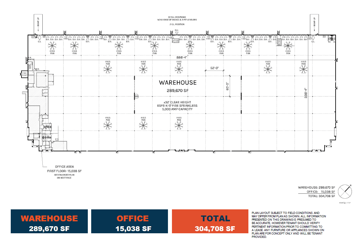 When considering practical use, this facility meets every requirement expected by current warehousing operators. At 32 feet, the ceiling height creates space ideal for stacking inventory deep and using vertical room wisely. Efficient movement begins at the loading zone, designed around 52 elevated docking stations - nine with recessed platforms, forty-three fitted with lip-style lifts - alongside two ground-access entries. Such layout accommodates massive inbound and outbound flows, enables rapid transfer between transport modes, and handles round-the-clock coordination across work periods.